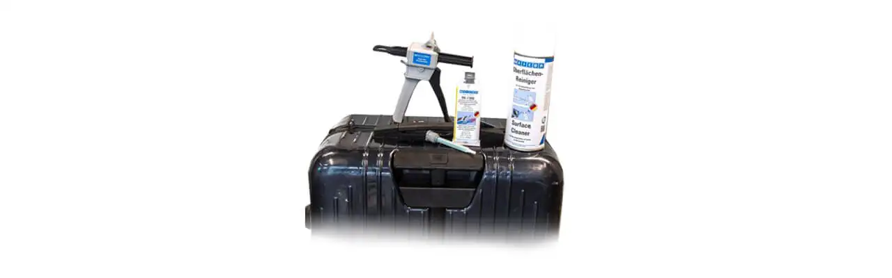Для склеювання коліщат валізи, виготовленої з матеріалу з низькою поверхневою енергією, рекомендуємо використовувати структурний клей WEICON Easy Mix RK-7300. Цей клей відрізняється відмінною адгезією до пластмас та високою міцністю, є в'язкопластичним та удароміцним. Заснований на ММА (метилметакрилаті) і що має завдяки цьому чудову клейку здатність, він може використовуватися саме для пластмас з низькою поверхневою енергією. Таким чином, цей продукт підходить для нашої пошкодженої валізи в усіх відношеннях.