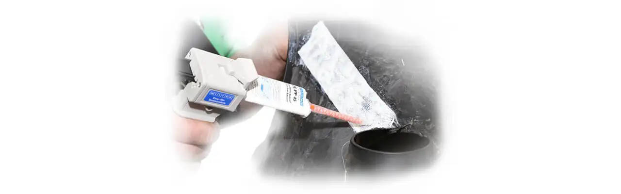 Використовуваний тут структурний клей складається з двох компонентів. Завдяки подвійному картриджу та соплі він вже змішаний у відповідних пропорціях, і клей можна рясно нанести на отвір зсередини. Потім клей слід розподілити шпателем. Далі накладіть на тріщину шматок скловолокна, обрізаний за розміром, і притисніть. Не забудьте надіти рукавички або використовувати інструмент, щоб руки не контактували з клеєм. На завершення знову нанесіть клей і залиште для затвердіння при кімнатній температурі.